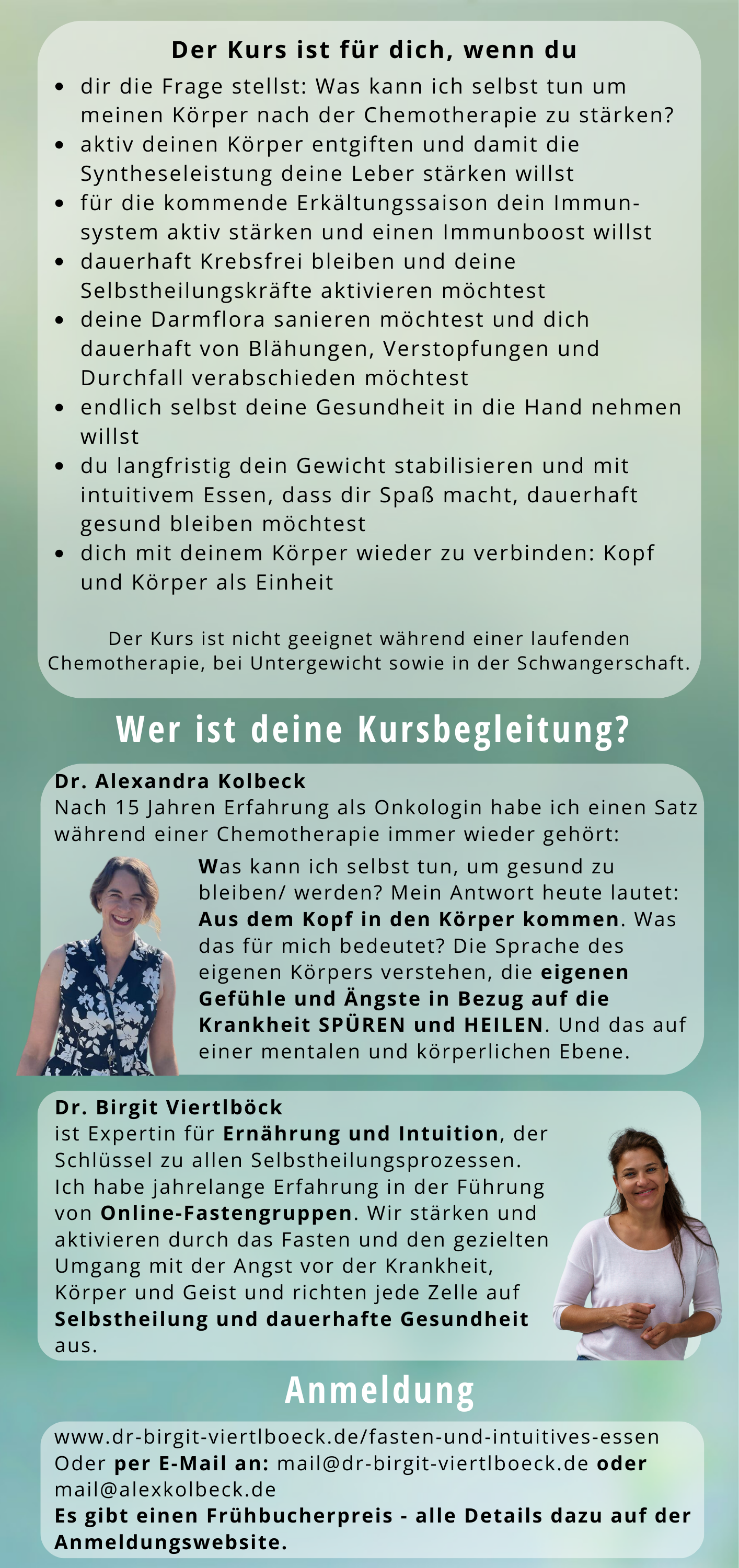 Kursbegleitung mit Onkologin Dr. Alexandra Kolbeck und Fastenleiterin Dr. Birgit Viertlböck